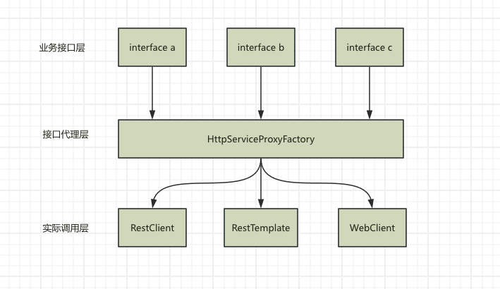 2. 原理 其实,从架构上来说,spring框架并没有对外接口调用的底层做太多的改变,HTTP Interface 是在原先的RestTemplate这类http客户端的上面,又搞了一个接口代理层, 代理层上面是我们HTTP Interface的接口定义部分,然后通过代理层的代理,将http 请求功能转发到底层的http客户端实现。而这底层的http客户端实现,就是我们之前使用过的RestTemplate,以及spring6.x 新提供的RestClient。
